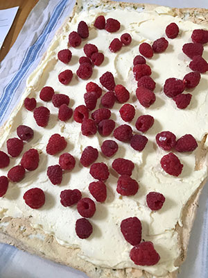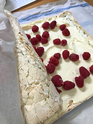 - Spread the raspberries evenly over the cream. Roll up the meringue starting at one of the short sides using the parchment and teatowel to help you. Carefully transfer to serving plate and serve with extra berries and a few chopped or shredded nuts if desired