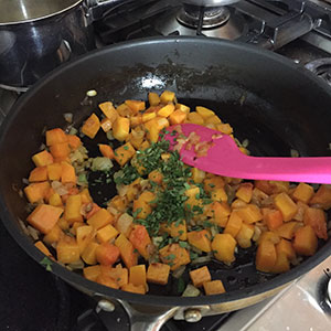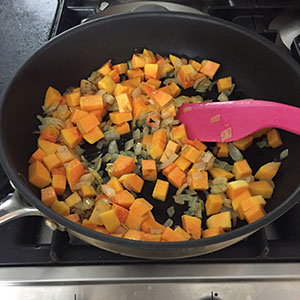 - Stir in the pumpkin and continue to sauté over a low heat until the pumpkin is just tender about 5 –15 minutes, depending on which variety of pumpkin you use. Stir in the chopped sage.