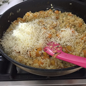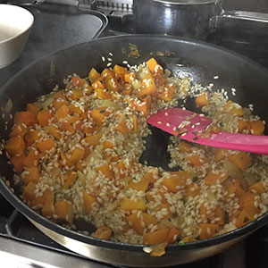 The pumpkins that you buy for making Jack 0'lanterns do not have the best flavour or texture for cooking. So I would recommend using a smaller, tastier variety or even a butternut squash to make this risotto. However, if you have hollowed out a pumpkin, there is no need to waste the flesh. Just add some extra seasoning and perhaps a little more cheese to help make up for its inferior flavour. The pumpkin is sautéd until just tender before adding the rice. It is hard to say how long this stage will take as it will vary according to the variety you use but, as a guide, should take anywhere between 5 and 15 minutes.