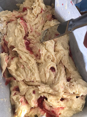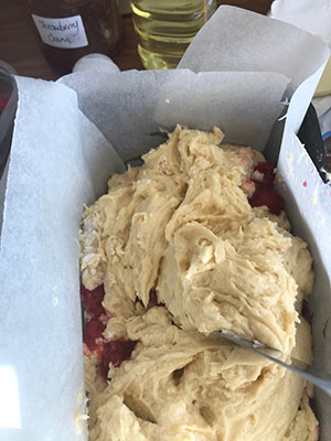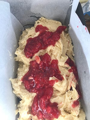 Hi there, I am just about to try your recipe - thank you. I notice the photos of the cut loaf do not seem to show the raspberry and jam mix that you say to add to the cake in layers. Why is this please?