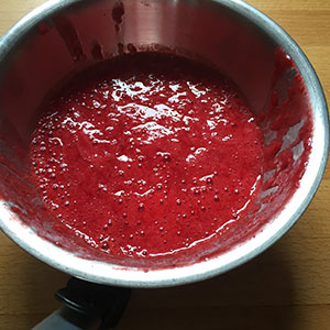 - Push the raspberries through a nylon sieve to make a seedless purée, reserving 6 raspberries to decorate.