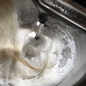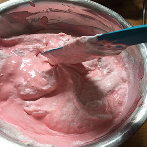 - Whisk the egg whites until standing in soft peaks. Gradually whisk in the caster sugar, and fold into the raspberry cream mixture.