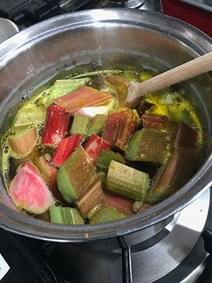 - Add the rhubarb and bring to a gentle simmer. Cook for about 15 minutes until the rhubarb is falling apart.