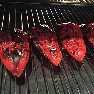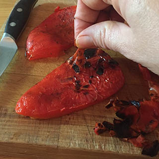 - Place the peppers skin side up on a grill pan and cook under a hot preheated grill until the skin blackens and chars. Place in a bowl and cover with a tea-towel. Allow to stand until cool enough to handle.