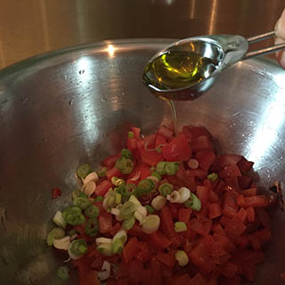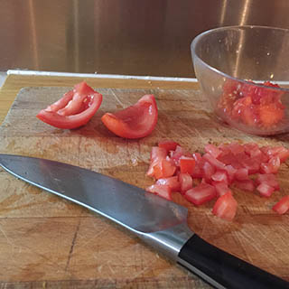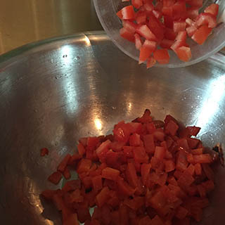 - Cut the tomatoes into quarters. Scoop out and discard the seed. Cut into small dice and add to the peppers.