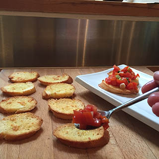 - When ready to serve place the crostini on a serving plate and top with the pepper mixture. Serve immediately.