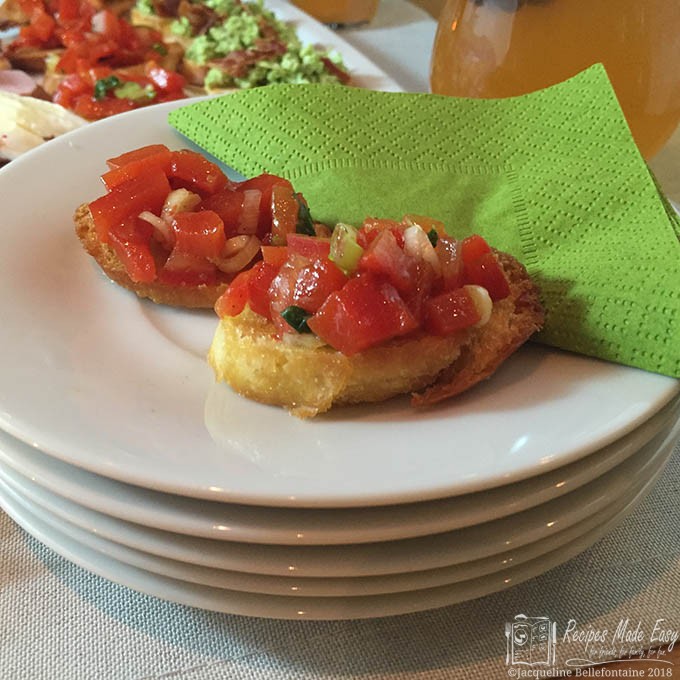 These crostini are topped with a delicious marinated red pepper mixture and can be served as a snack, starter or with pre-dinner drinks. The flavours remind me of summer, but you can serve them any time of the year. To be honest, they are probably best in summer since both peppers and tomatoes seem more flavourful in the summer. That said, their bright red colour looks fabulous as part of a festive spread, and they still taste good at other times of the year.