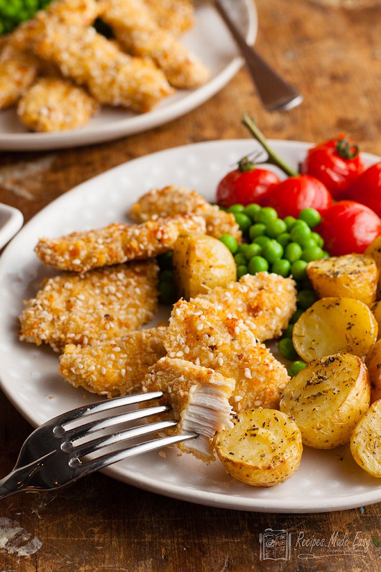These oven-baked sesame seed chicken nuggets with mini roast potatoes make a delicious midweek meal and are a much healthier variation on the popular fast food takeaway. They will be enjoyed by young and old alike.