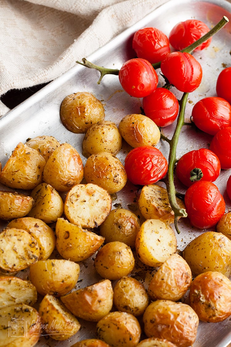 - Pop the potatoes into the oven near the top for 30 minutes, until tender and golden. Add the tomatoes to the tray for the last 10 – 15 minutes of cooking.