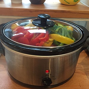 - Pile the peppers on top, cover and cook on high for 8 hours. Season to taste.