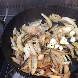 - Reduce the heat and add the onions. Fry for 10 to 15 minutes until the onions have softened and are beginning to brown. Stir in the garlic, sugar and vinegar and cook for another minute or two.