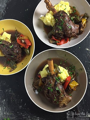 Slow cooked lamb shanks with onions and peppers