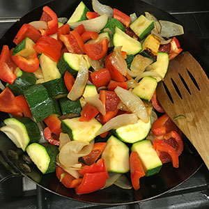 - Add the pepper and courgette and continue to cook stirring occasionally for about 5 minutes until just softened and just beginning to colour.
