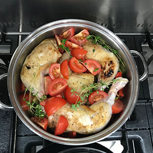- Add the tomatoes and thyme to the pan, cover and simmer gently for 20 to 25 minutes or until the chicken is cooked through.