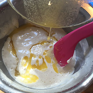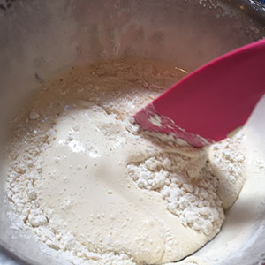 - Sift in the plain flour and add the ground almonds and almond extract and gently fold in. Drizzle the melted butter over the top and fold in until just combined.